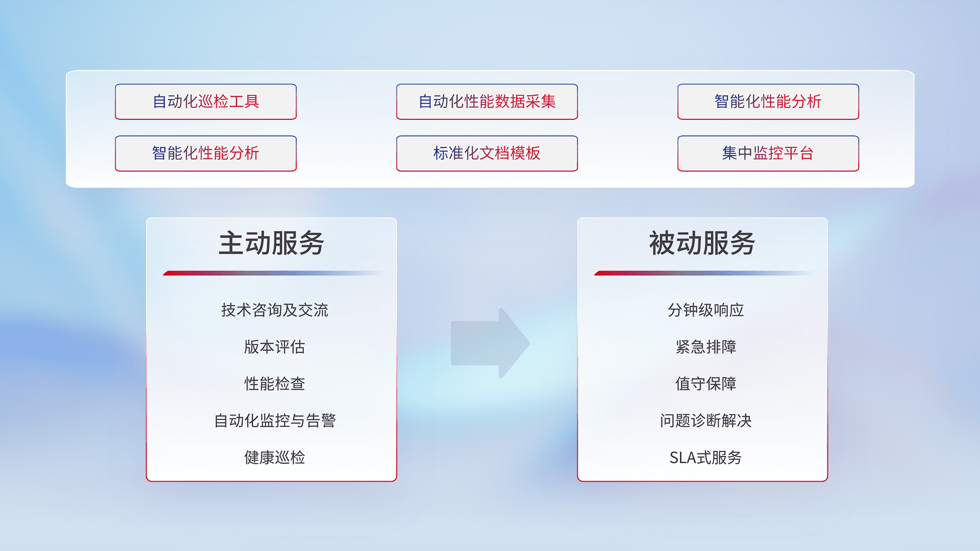 智能化工具和标准化文档,,保障服务质量,,提供主动服务(包含技术咨询、、、、版本评估、、、性能检查、、、、自动化监控与告警、、、、健康巡检)和被动服务包含(分钟级响应、、、、紧急排障、、、值守保障、、问题诊断解决、、、SLA服务)。。。