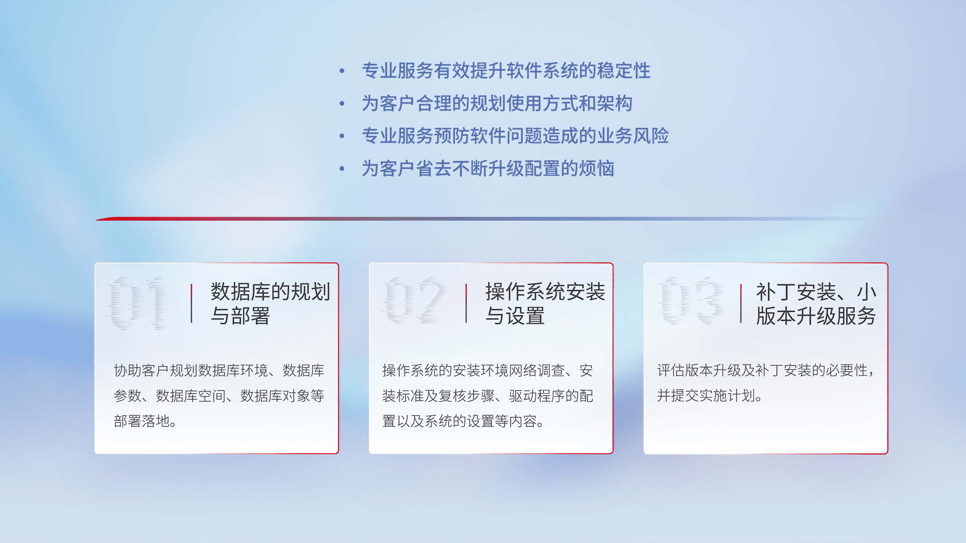 为客户提供软件规模升级、、、、快速部署、、、、按需配置的专业服务,,从数据库的规划与部署到操作系统的安装与设置,,再到补丁安装和小版本升级提供支持。。